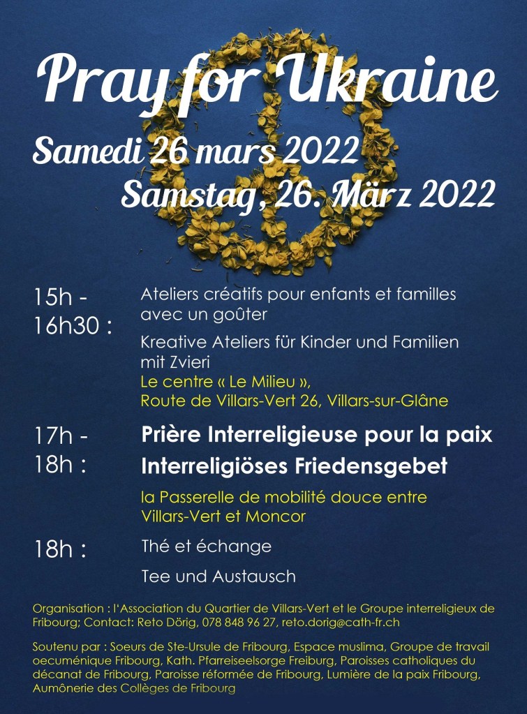 Interreligieux - Begegnung, PriĂšre - Meditation Pray for Ukraine đ PubliĂ© par frisoul le 24 mars 202224 mars 2022 Samedi 26 mars / Samstag, 26. MĂ€rz PriĂšre, ateliers, Ă©changes: vous ĂȘtes tous les bienvenus! Partager : Cliquer pour envoyer un lien par e-mail Ă un ami(ouvre dans une nouvelle fenĂȘtre) E-mail Cliquer pour imprimer(ouvre dans une nouvelle fenĂȘtre) Imprimer Jâaime chargement…