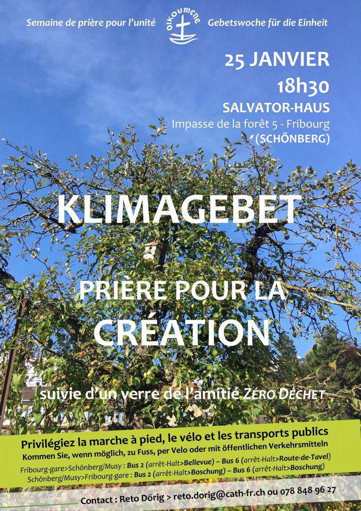 Le lundi 25 janvier à 18h30, lors de la semaine de prière pour l’unité des chrétiens, nous invitons à une prière pour la création avec la communauté des salvatoriens (Salvator-Haus), Impasse de la forêt 5 à Fribourg (Schoenberg).
