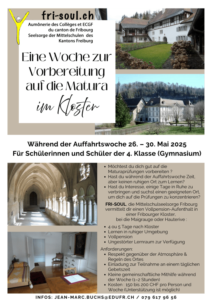 Die Seelsorge freut sich, Ihnen zur Vorbereitung der Maturitätsprüfungen eine « Studienwoche im Kloster » anbieten zu können.